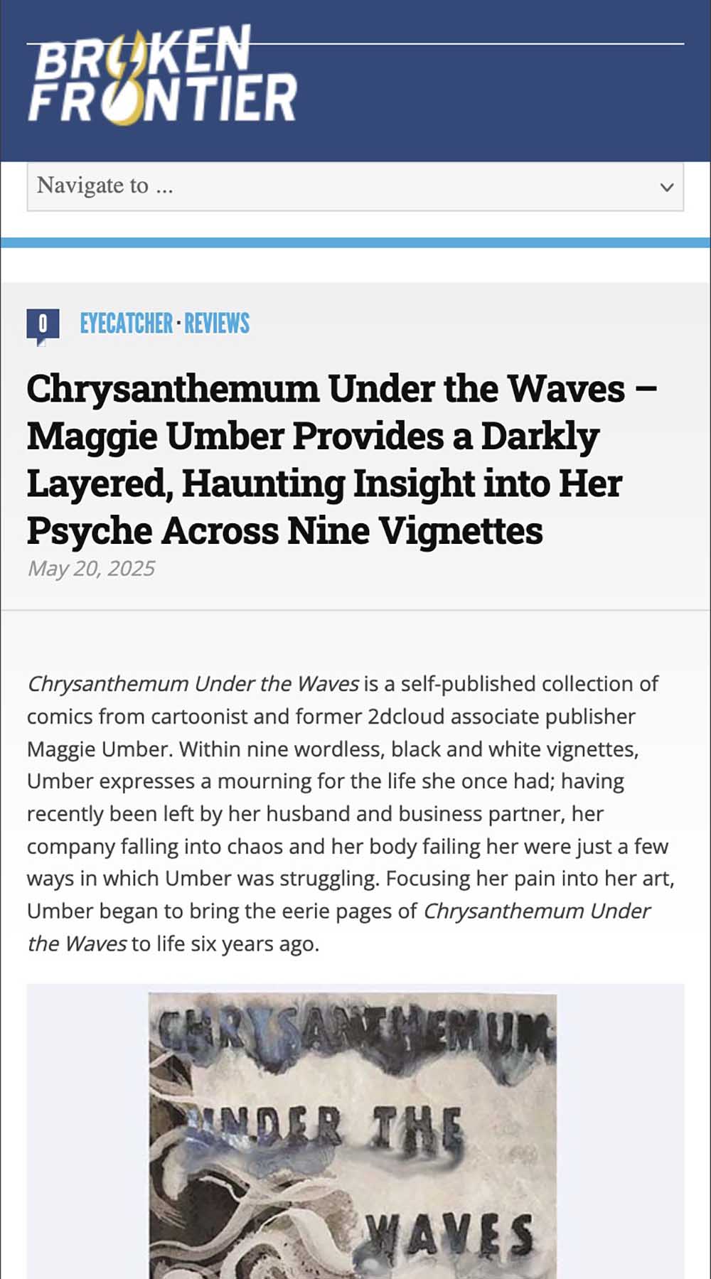 Today on Broken Frontier, Lydia Turner reviews Chrysanthemum Under the Waves – Maggie Umber Provides a Darkly Layered, Haunting Insight into Her Psyche Across Nine Vignettes. It means so much that she writes I should be "immensely proud of the darkly layered, haunting insight into her psyche that she has so bravely bared to the world"! I am so grateful for her review. She says in part:
