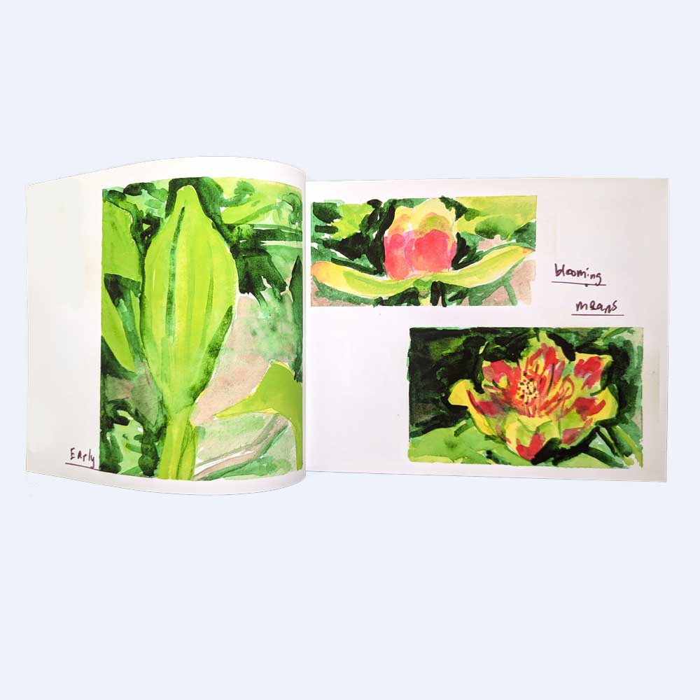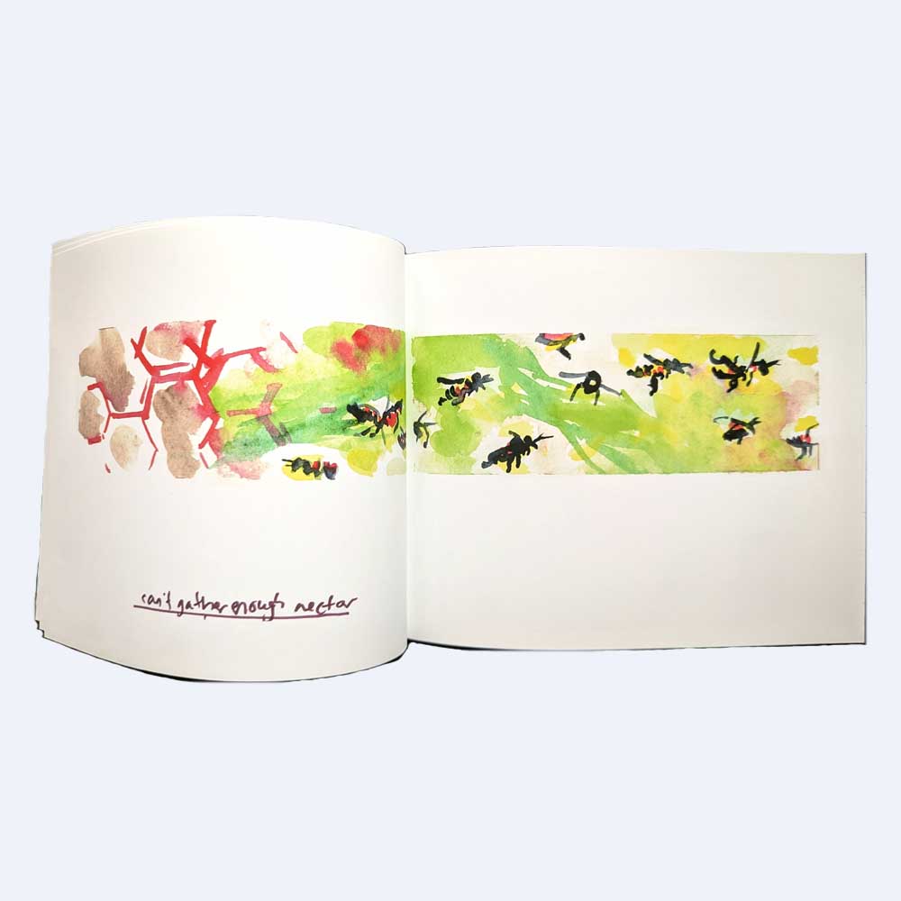 an impressionistic watercolor look at the pollination process. It concludes with a page noting how global warming has disrupted this progress