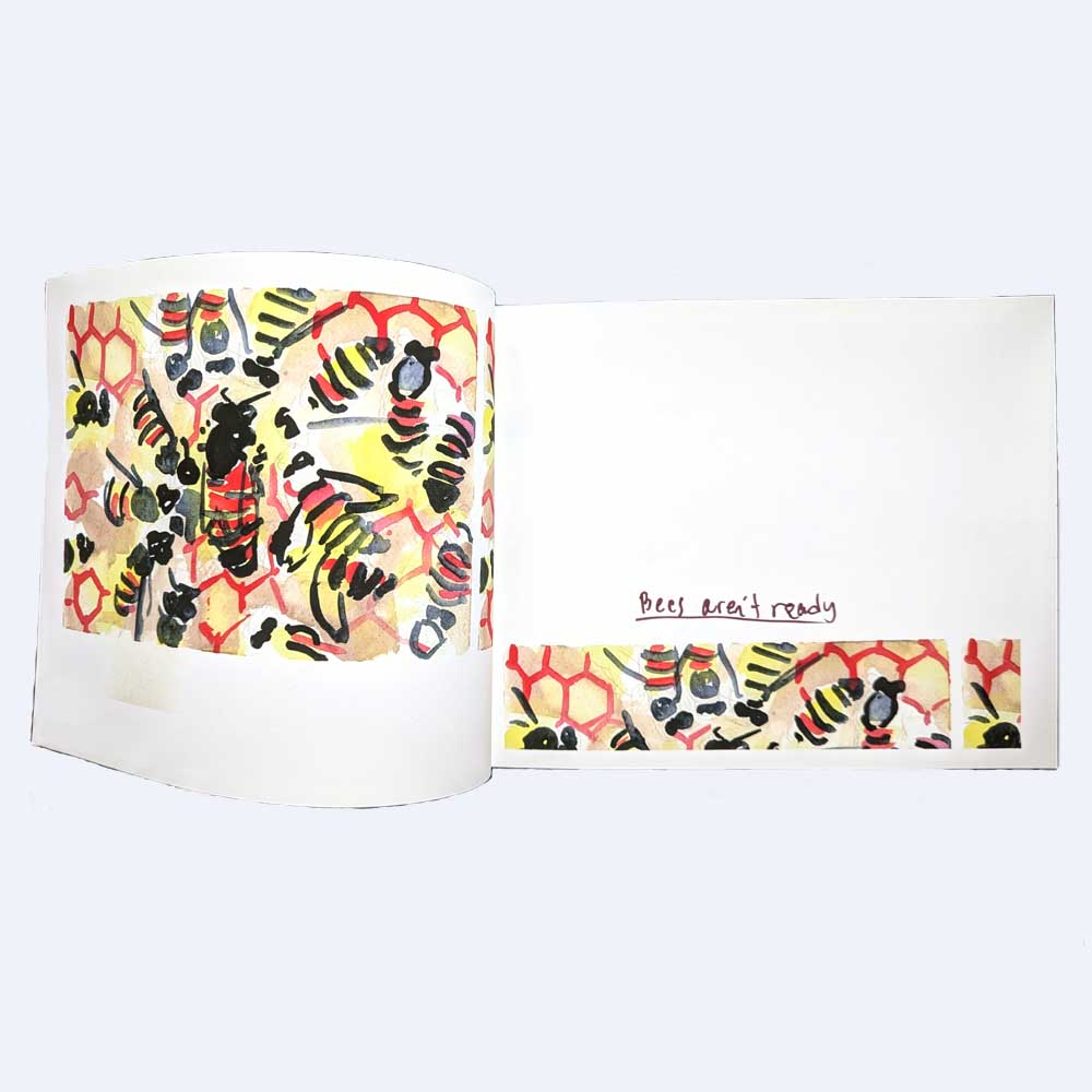 Sloppy and pleasing images of bees working on flowers conclude with a scrawled message about early blooming, a symptom of global warming.